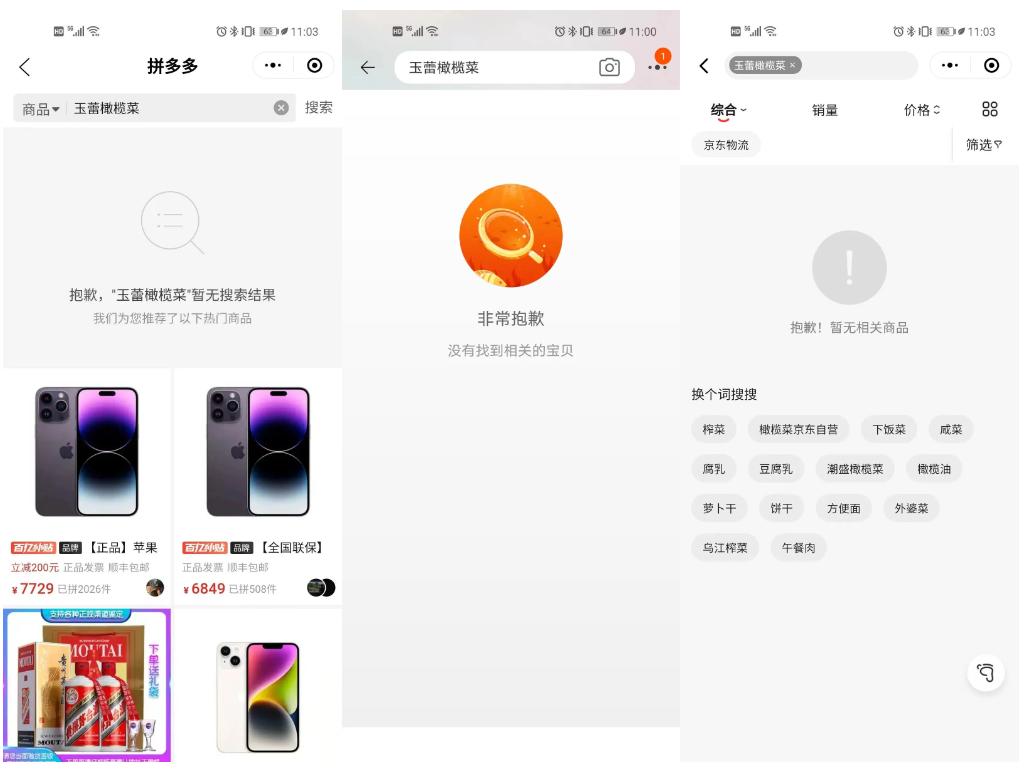 记者在淘宝、京东、拼多多等平台检索发现,目前,玉蕾食品旗舰店产品已下架,同时,检索“玉蕾橄榄菜”等关键词已无法找到涉事产品。