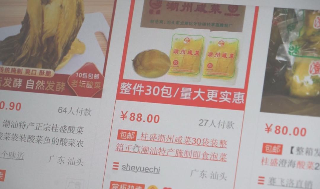 广东民生DV现场3月15日报道, 目前电商平台上销量较好的商家出售的都是 “桂盛”品牌 的酸咸菜,而它的生产企业是汕头市龙湖区外砂锦桂果蔬腌制厂。