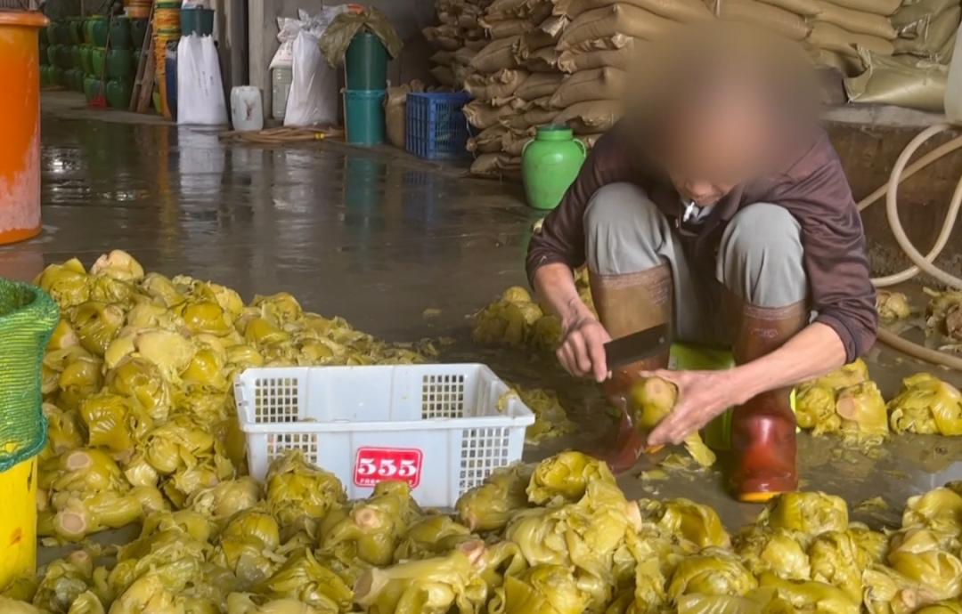 在南社村的汕头沐彤园食品有限公司, 工人直接赤脚踩在南姜上。 而这些南姜是用来增加酸咸菜的风味。被问到会不会辣脚时, 工人称“习惯了就不辣了”。
