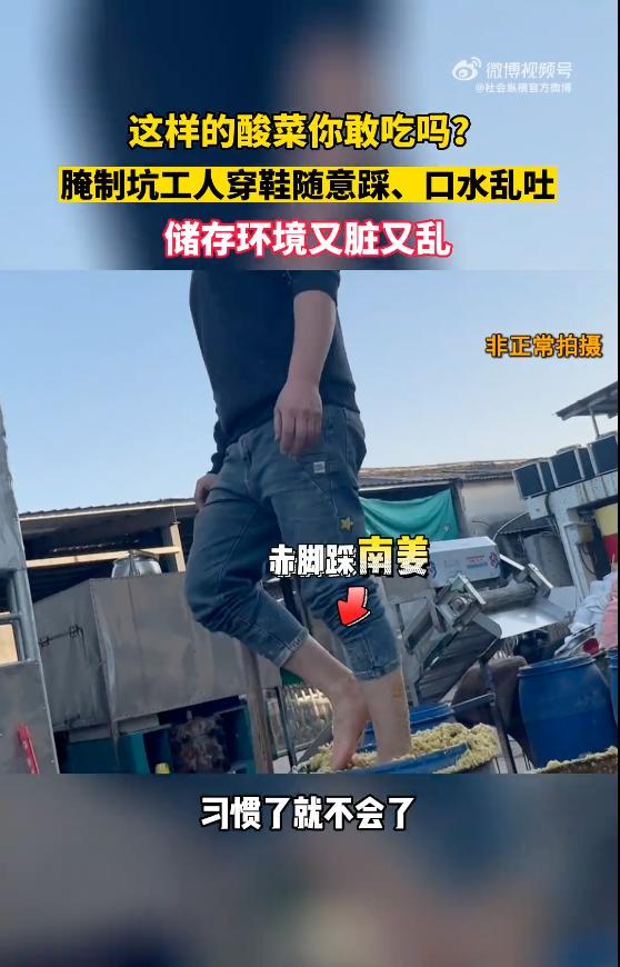 土坑酸菜2.0?网友已看吐,工人赤脚踩姜“踩多了就不辣”,还向腌制坑口吐白色异物,原料堆马路腐烂污水横流、腐臭弥漫…