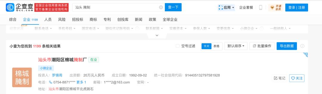 3月15日,小编在企查查中,输入关键词“汕头 腌制”进行搜索,可以查询到 1199家相关公司。