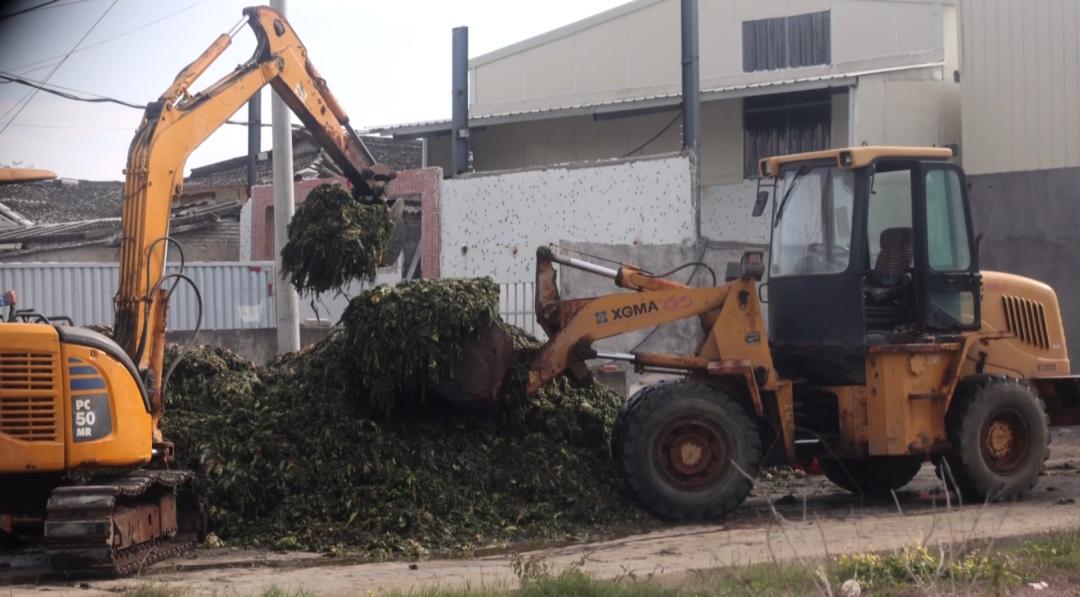 3天后,有工作人员操作挖掘机,将地上的芥菜搬运到铲车上,运至仓库中。多番询问,记者得知,这堆腐烂的芥菜,将被用于橄榄菜制作, 而厂家正是知名大品牌——玉蕾橄榄菜。
