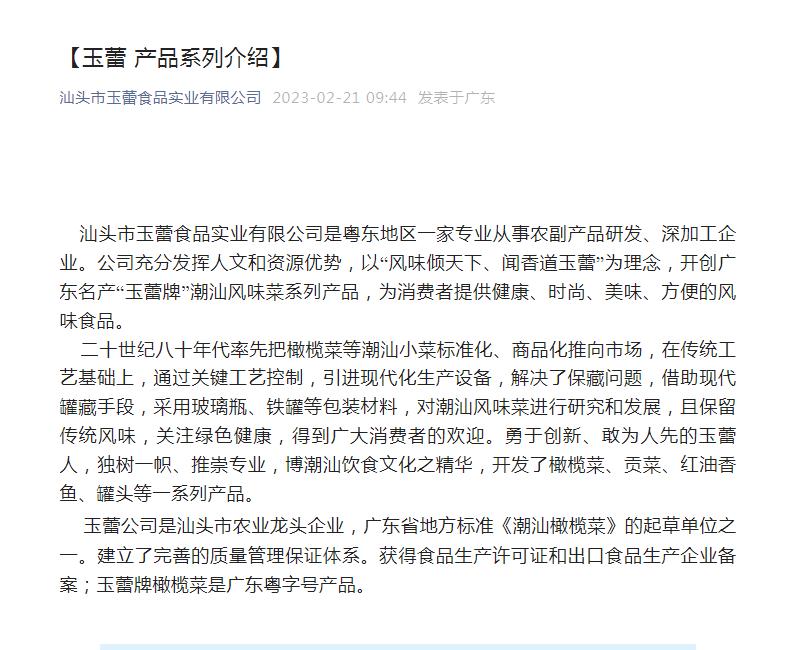另外,汕头市玉蕾食品实业有限公司官方微信公众号也显示,玉蕾公司是汕头市农业龙头企业,广东省地方标准《潮汕橄榄菜》的起草单位之一。建立了完善的质量管理保证体系。获得食品生产许可证和出口食品生产企业备案;玉蕾牌橄榄菜是广东粤字号产品。