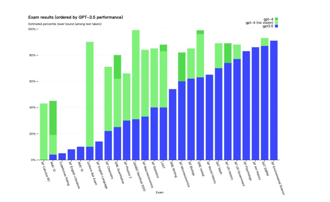 直白地说,GPT-4在专业和学术方面表现出近似于人类的水平。例如,它通过了模拟律师考试,且分数在应试者的前 10% 左右;而GPT-3.5 的得分在倒数 10% 左右。
