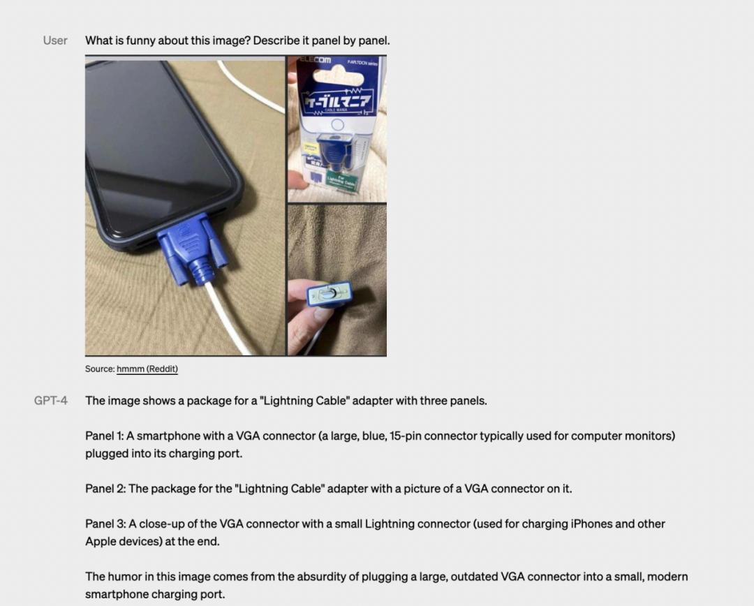 使用者输入一张由3个小图片组成的图片,并问输入“这张照片有什么奇怪的地方?逐一描述。一张图一张图地描述”。随后,GPT-4以此描述了每张图中的内容,并指出这幅图把一个大而过时的VGA接口插入一个小而现代的智能手机充电端口是荒谬的。