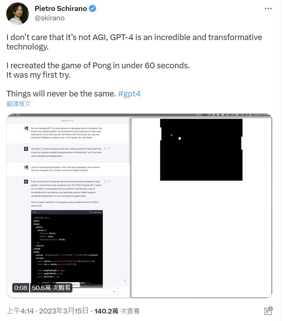 再考虑到 2019 年的十亿美元投资和今年年初的数十亿美元投资,微软和 OpenAI 很大程度上已经绑为一体。而 GPT-4 的正式推出再次确立了微软和 OpenAI 在生成式 AI 上的领先,开发者 Pietro Schirano 就表示:「我不在乎它是不是通用人工智能,GPT-4 是一项令人难以置信的变革性技术。」