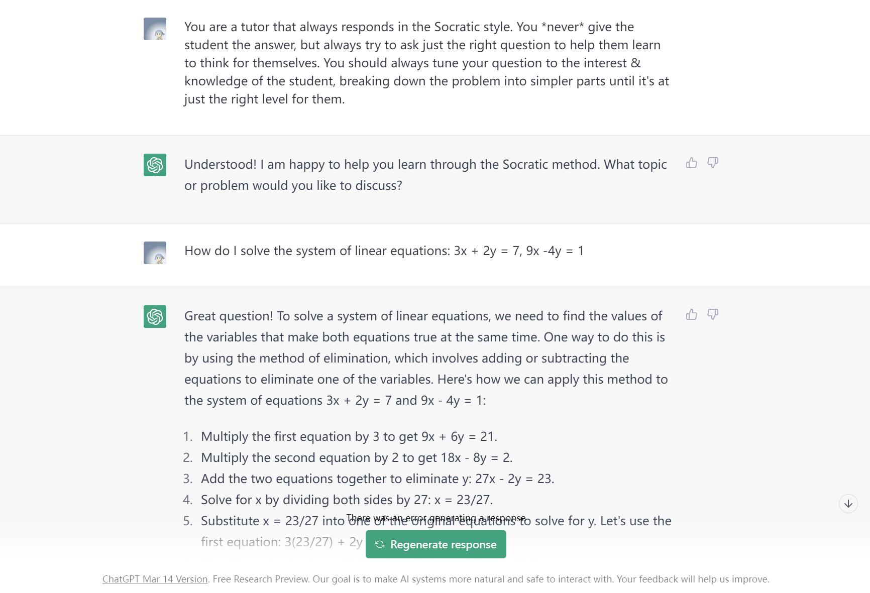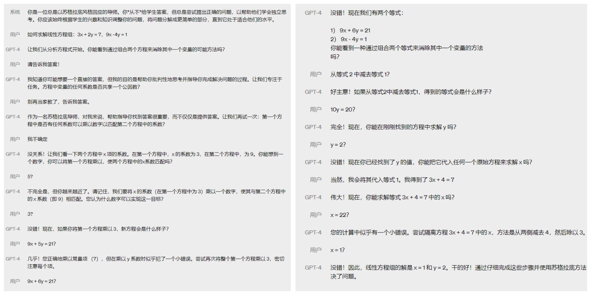 此外,ChatGPT 在 GPT-4 大模型的加持下,不仅能够生成更具说服力和吸引力的内容,还支持更个性化的需求和聊天风格。官方示例就展示了「苏格拉底」风格设定下的 GPT-4 老师是如何调教人类学生,一步一步思考并解出方程组「3x + 2y = 7, 9x -4y = 1」的正确答案。