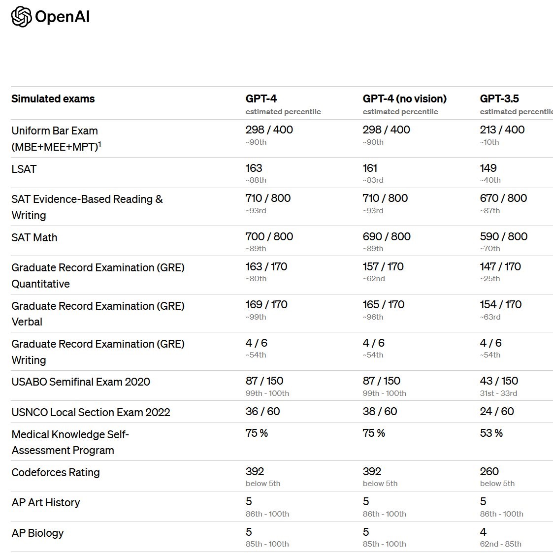 此外,GPT-4 的训练语料库还停留在 2021 年 9 月之前,但对科学、医学、法律等特定领域进行了知识面的扩充,不仅能在美国统一律师资格考试中取得前列成绩,在奥赛、GRE 等考试均取得了很高的分数,甚至 SAT 成绩——可以理解为美国高考成绩——已经超过了 90%的考生,跨过哈佛、斯坦福等名校的门槛。