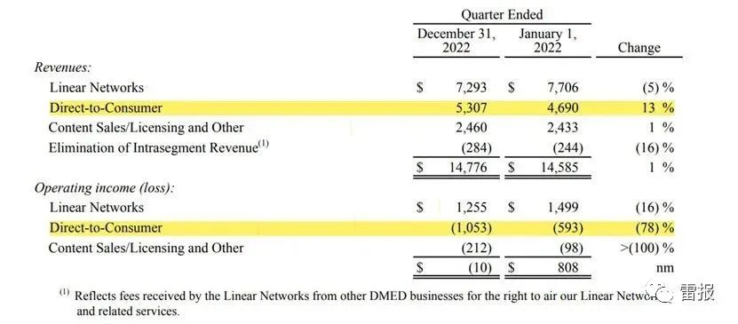 上迪票价调整与公司的经营情况脱不开关系,华特迪士尼2023财年第一季度财报(即自然年2022年第四季度)显示,其在该季度的营收为235.12亿美元,同比增长8%;净利润为12.79亿美元,同比增长11%;而具体到旗下业务的表现,其中乐园、体验及产品部门营收87.4亿美元,同比增长21%,经营利润为30.5亿美元。但媒体与娱乐发行部门的经营亏损为1000万美元,其中流媒体业务(Direct-to-Consumer)亏损更是达到了10.53亿美元,同比扩大78%。