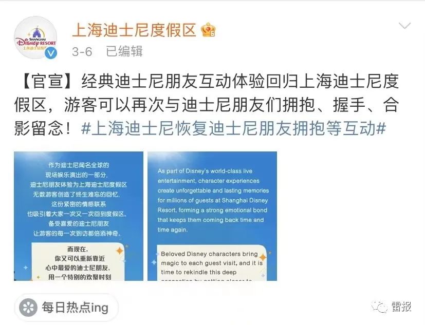 此前,3月6日上午,上迪官方发布消息称,经典迪士尼朋友互动体验回归度假区,该日起游客可以走近其喜爱的迪士尼朋友并与他们亲切互动,包括拥抱、握手、同框合影等。签名和与迪士尼朋友进餐体验则将于晚些时候恢复。微博相关话题有3.2亿次阅读,多达3.6万次讨论,强势冲上热搜。