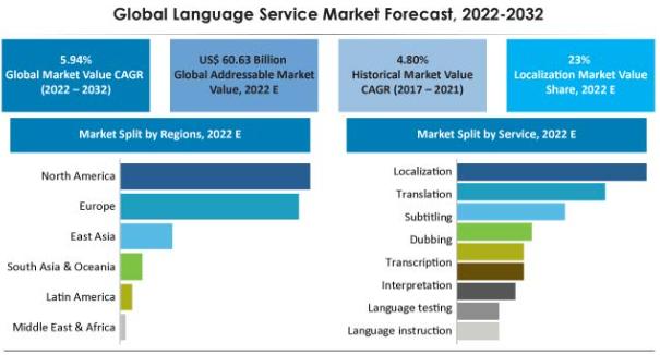 2022 年,全球语言服务市场价值 607 亿美元,预计到 2032 年底将达到 962 亿美元。我们愈发感受到技术发展使语言翻译比以往任何时候都更容易获得、更容易和更便宜。特别是全球语言翻译软件市场在 2021 年价值 93 亿美元,预计到 2031 年将达到 448 亿美元。