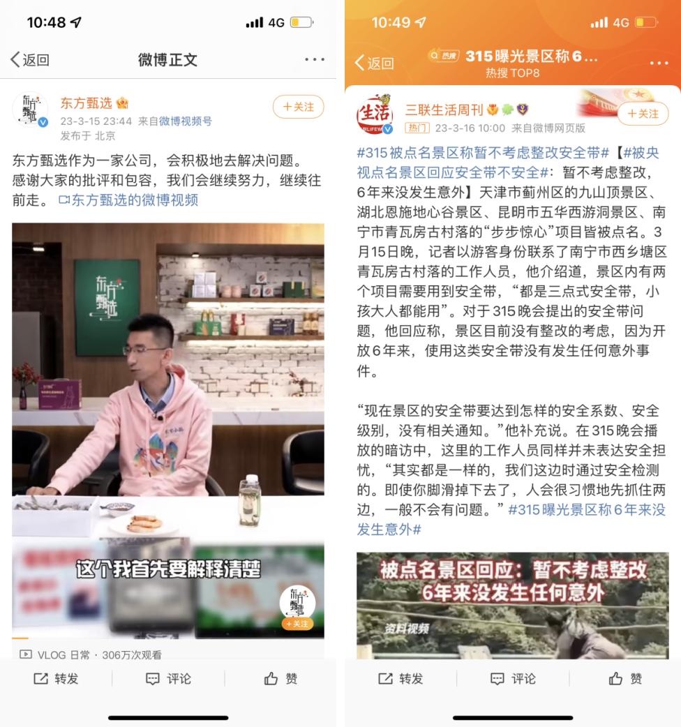 而315曝光的景区安全带问题,被点名景区则回应暂不考虑整改。两者面对危机公关的处理方式,显然前者要比后者更为稳妥。