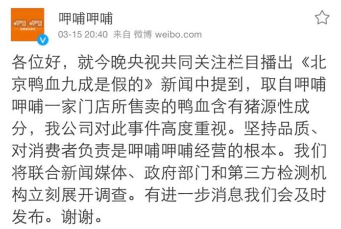 面对危机,呷哺呷哺当晚通过微博发布声明,表明公司对于该事件的高度重视态度。并宣布即日起停售鸭血,配合有关部门、媒体和检测机构展开调查。