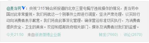麦当劳的快速回应为品牌赢得了主动权,也最快的争取到了消费者和民众的理解。