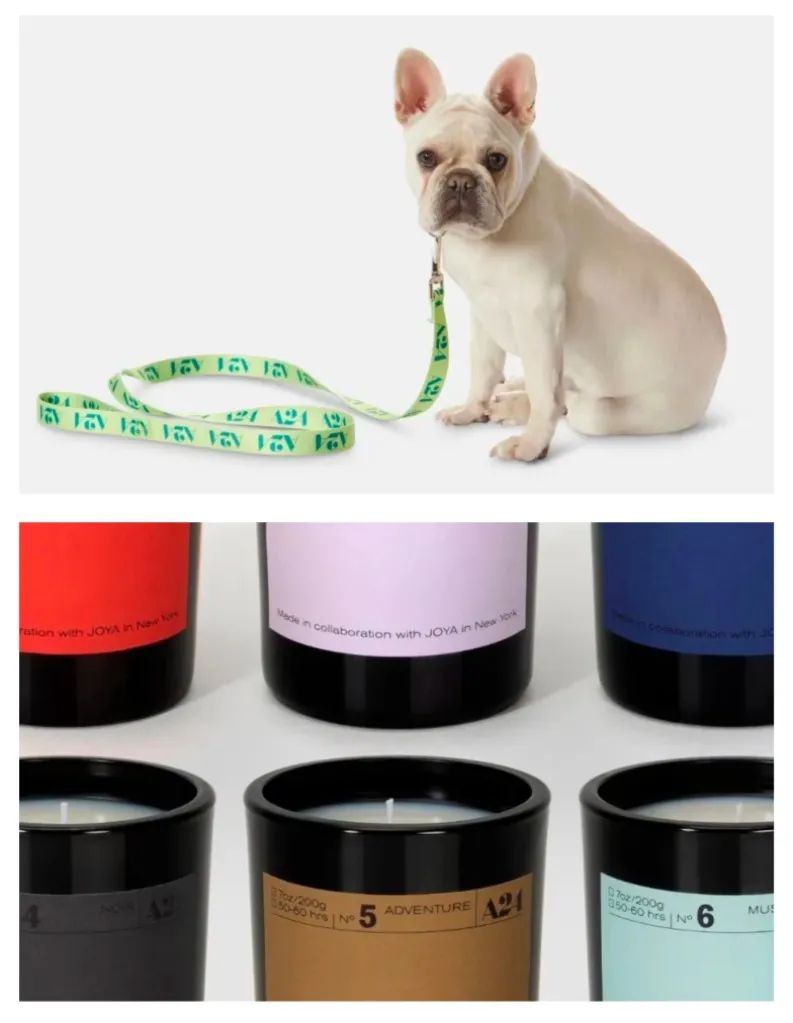 直接取材于电影的周边已经不算什么,A24 的周边种类已经多到令人目瞪口呆,堪称全方位无死角覆盖各种需求:雨伞、沙滩巾、马克杯、日历、宠物用品、香薰蜡烛……都以各种不同的方式与电影勾连在一起。