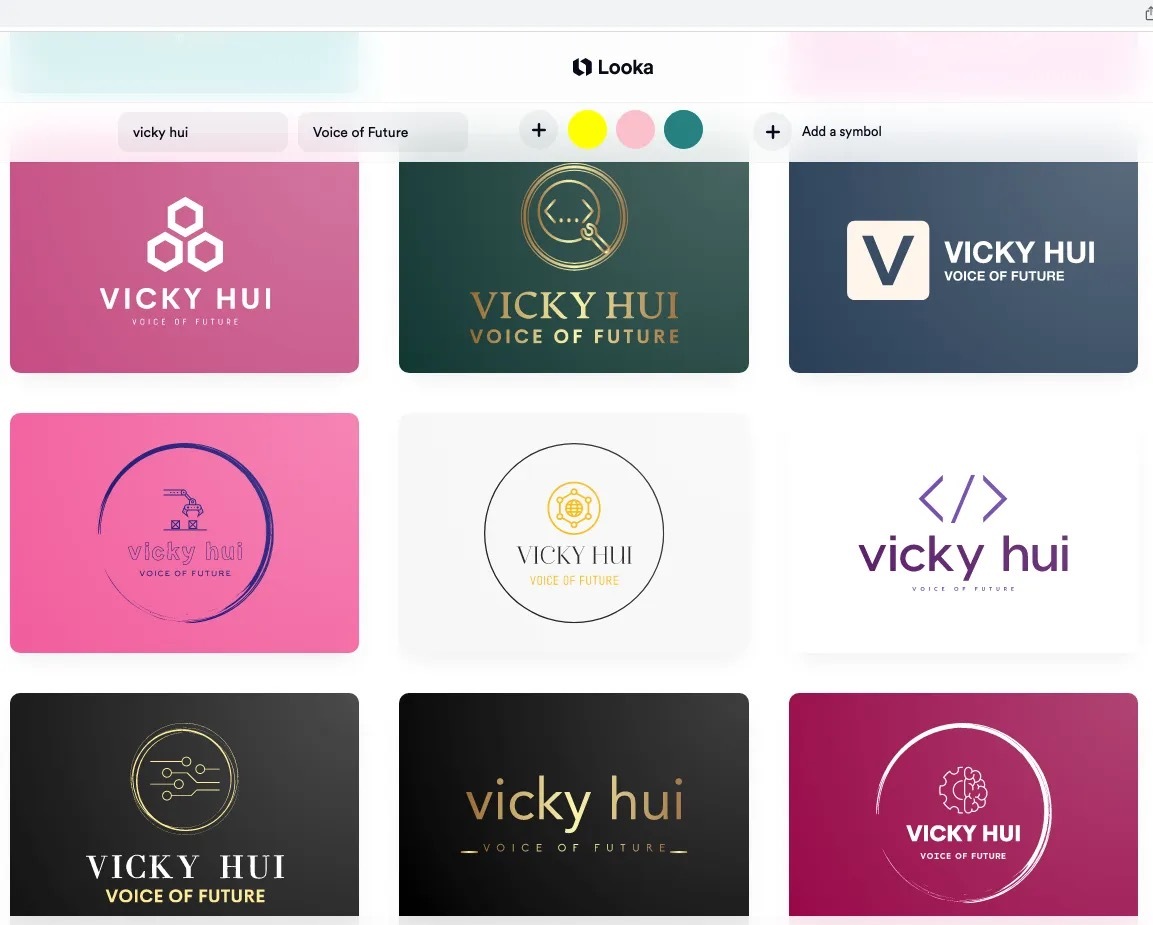 我尝试用它为我的个人品牌 Vicky Hui 创建一些 logo,想看看效果如何。我告诉了 Looka 我的名字、行业(人工智能和技术)以及我喜欢的颜色(我选择了粉红色、黄色和浅蓝色),得到了如下一些结果。