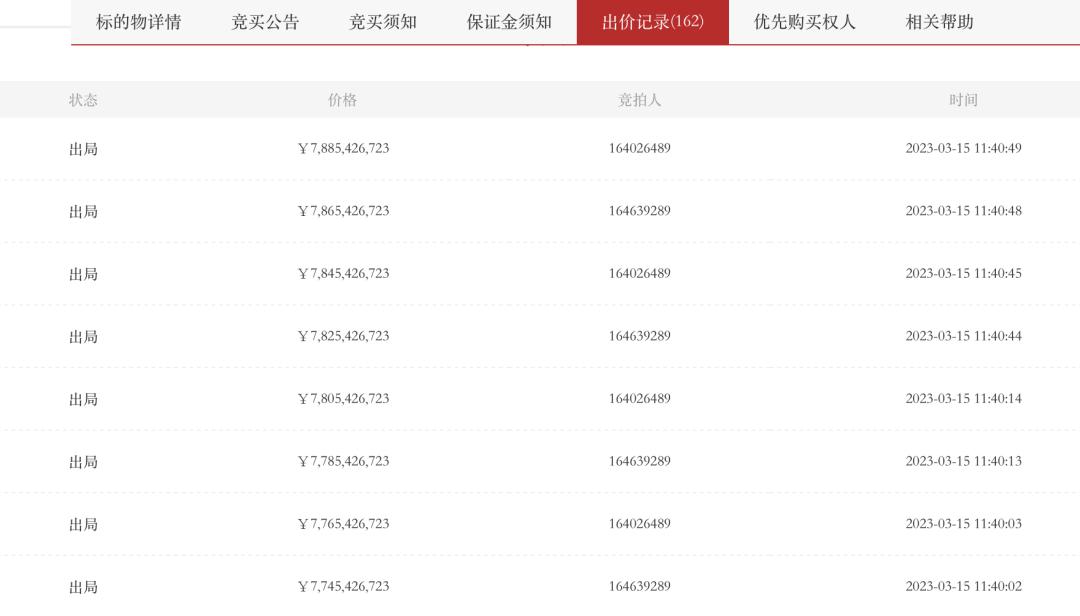 3月14日全天,该拍卖现场并不热闹,仅在当天晚间有一次出价,为起拍价58.65亿元,直至15日10时左右,这场激烈的股权争夺大战才真正拉开序幕。