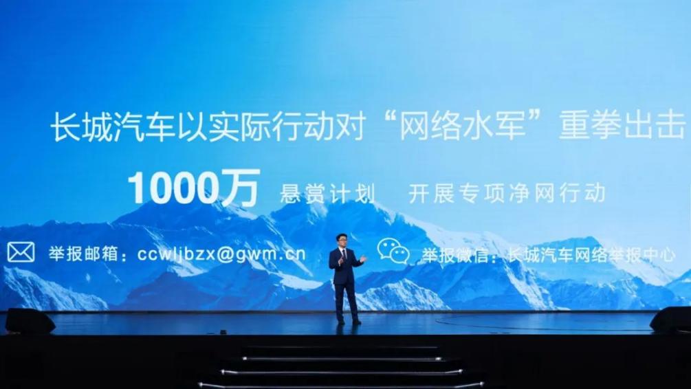 但是长城汽车在3月10号的发布会上,长城汽车汽车的副总裁傅小康痛斥友商,最后还祭出了“悬赏1000万,打击网络水军”的大招,让人瞠目结舌。