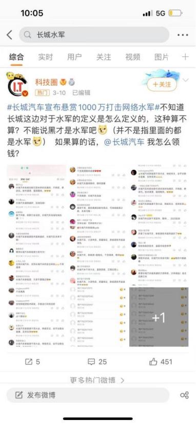 还有看热闹不嫌事大的网友贴出了“长城汽车痛斥网络水军,但评 论留言一片叫好”的微博截图——长城汽车此举,颇有些贼喊捉贼的意味。