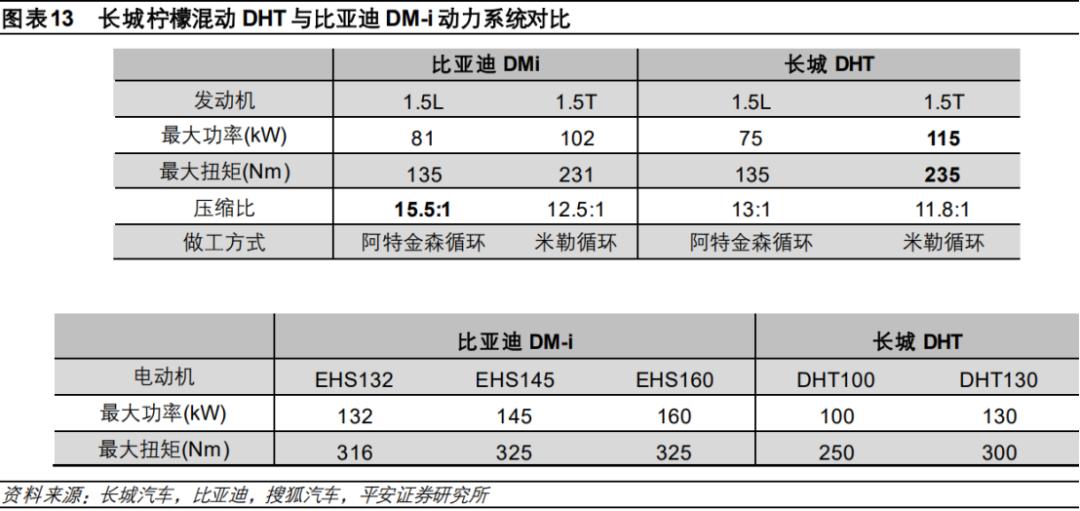 平安证券的研究报告指出,从技术路线看,长城汽车柠檬混动 DHT与比亚迪 DMi系统类似,比亚迪的技术路线以电为主,而长城汽车的混动系统更加依赖两挡DHT混动变速箱,这让长城汽车的柠檬混动比比亚迪混动有更强的加速性能。