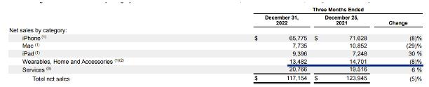 苹果(NASDAQ:AAPL)报告称,其可穿戴设备部门的销售额下降了 8% 以上,其中包括 HomePod mini、AirPods、Apple Watch、Apple TV 等的销售额。