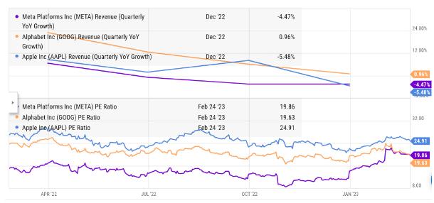 苹果的市盈率高于谷歌和 Meta,而其收入增长低于其他大型科技公司。像其可穿戴设备部门这样的潜在增长动力的突然下滑可能会损害公司的估值倍数,并导致未来几个季度的大幅调整。