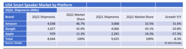 2022 年第二季度苹果智能音箱出货量下滑。资料来源:Omdia