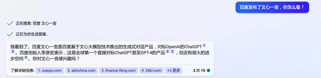 当你有疑问,不想查大量的文献资料,它替你查,并且“消化”完讲“人话”总结给你。在新 Bing 界面中,你现在最多一次可以跟它对话 15 轮。它有“理解”上下文的能力,所以你可以追问一个未被解答清楚的疑问。