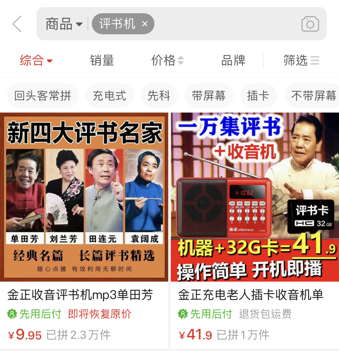 评书机,其实就是用来听评书的播放器,本质上和常见的小音箱没啥区别,内容一般由商家提供,如果客户有需求,也可以存入流行音乐播放。评书机在电商平台的售价大致上是20-100元,高级点的款式配有收音机功能,即便没有网络下载内容,也可以听听电台。