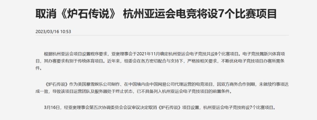 对于《炉石传说》项目的取消,亚奥理事会表示,《炉石传说》作为美国暴雪娱乐公司制作、在中国境内由中国网易公司代理运营的电竞项目,因双方商务合作到期,未就续约事项达成一致,导致该项目运营团队及服务器处于终止状态,已不具备列入杭州亚运会电子竞技项目的前置条件。