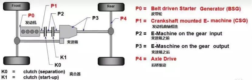 并联式混合动力根据电机位置不同可以分为P0~P4,P0~P1无法与内燃机脱开,所以他们不能单独驱动车辆,因此只用作微混系统或辅助作用。