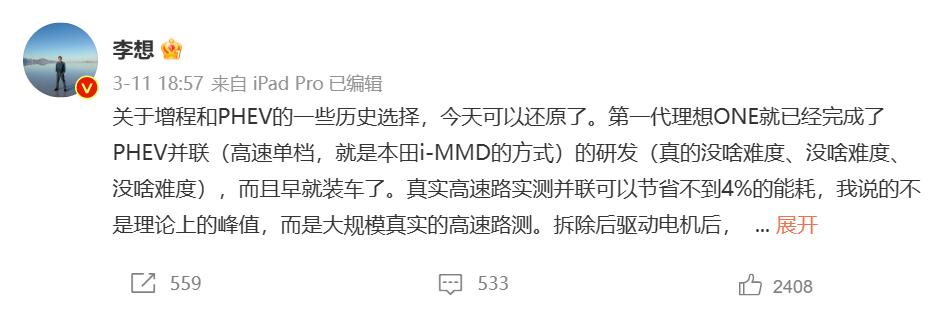 理想汽车CEO李想也曾解释过理想串联模式的选择理由。即牺牲部分NVH性能换来节省4%的油耗是否值得。显然李想认为不值得。