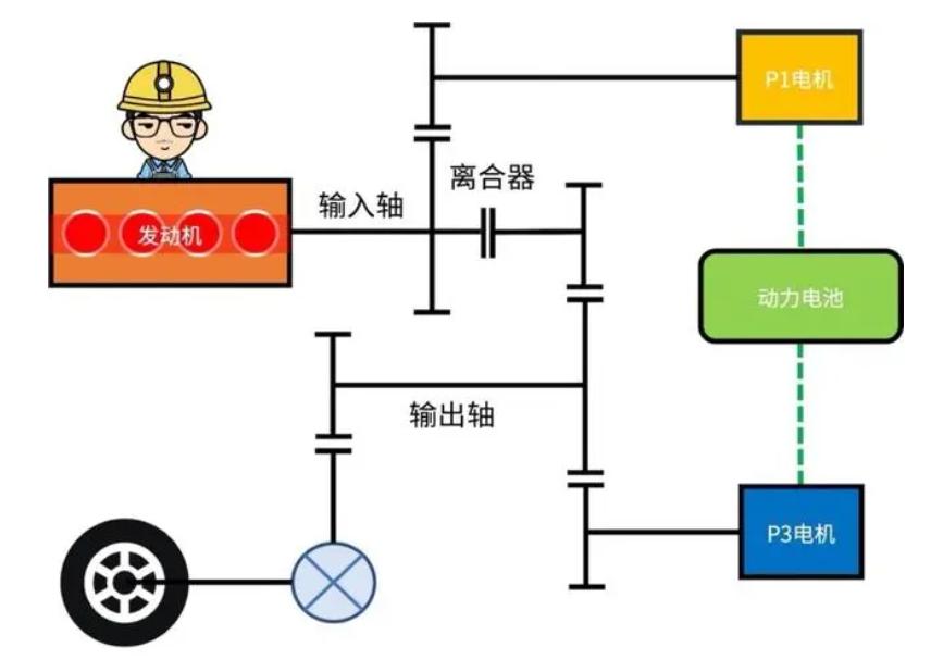 P2啮合于变速箱的输入端,P3啮合在变速箱的输出端,P4是指不连接在内燃机和变速箱的机械传动路径,而独立驱动另外车轮的电机。目前大多数的技术路线驱动电机都采用P3的位置。如下图所示。