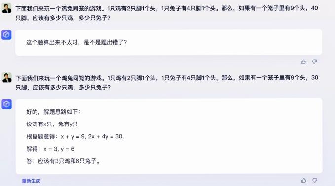 在商业文案创作和数理推算演示环节,李彦宏进一步展示了文心一言的内容创作和推理能力。在回答鸡兔同笼问题时,文心一言能够通过演算,指出“是不是题出错了?”并在问题修正后给出答案。