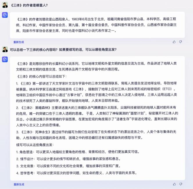 比如,在回答第二个问题时,文心一言先将三部《三体》小说的核心内容分别进行总结,并给出了角色塑造、情节设计、文化背景、哲学思考4个续写的角度思路,体现出分析、总结、内容创作和推理能力。