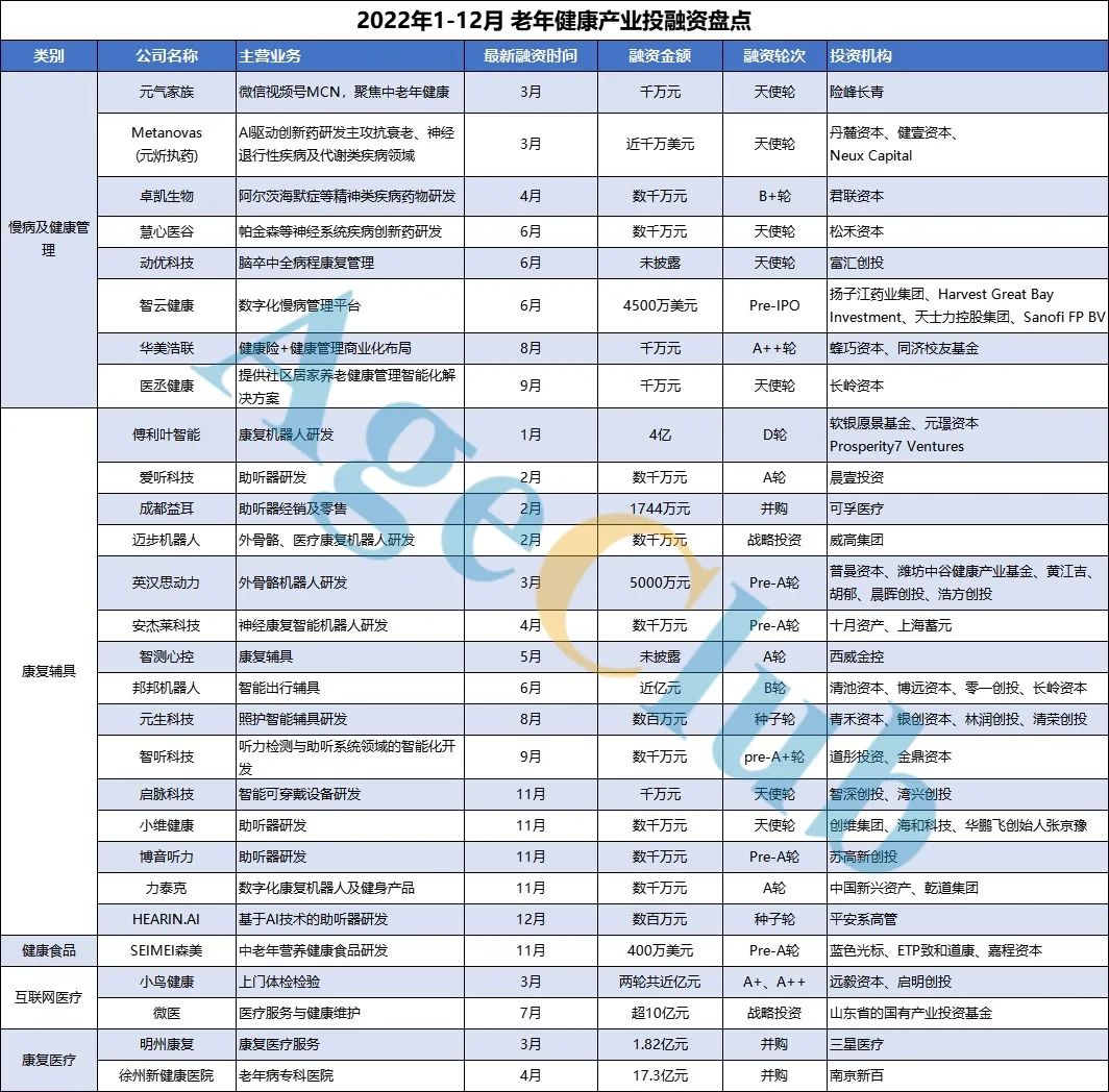 2022年,无论从融资轮次还是金额来看,中国在老龄经济领域的早期投资都较往年有了显著提升。同时,关注老年赛道的资本也显著增多。