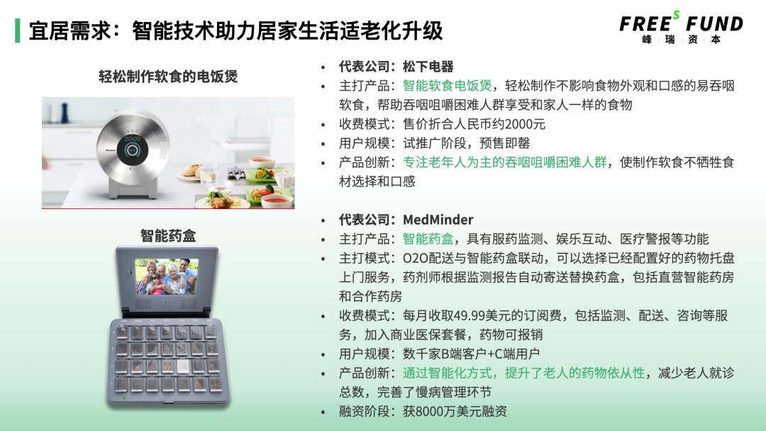 宜居需求,围绕老年人居家养老的安全、便利等需求衍生出一系列机会,比如智能家居产品、居家健康监测产品、移动辅助器械等等。