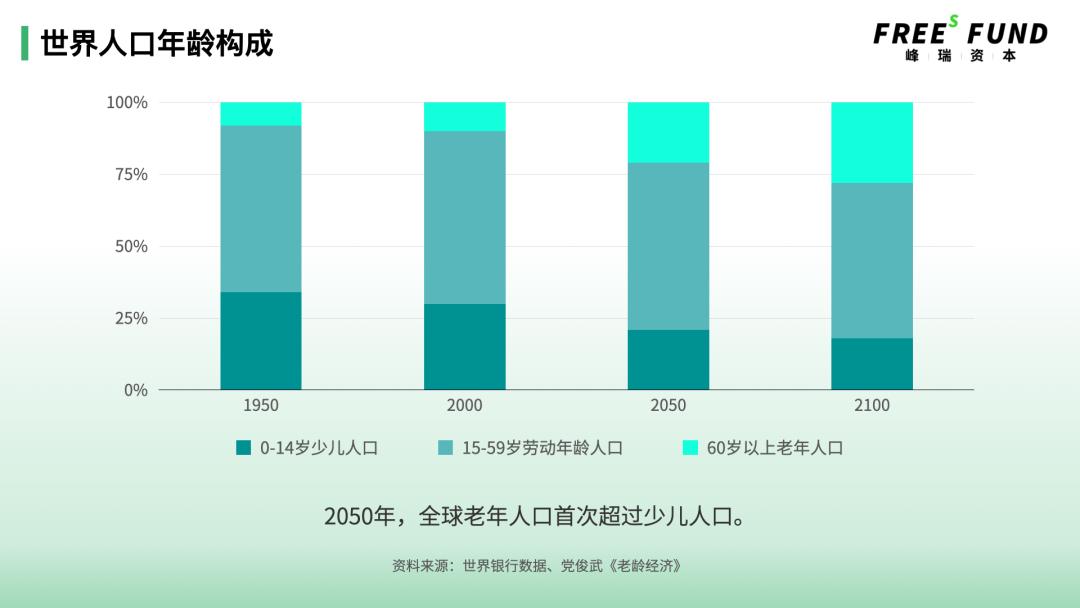 根据世界银行的数据库,以及全国老龄工作委员会第一届专家委员会委员、中国老龄科学研究中心副主任党俊武所著《老龄经济》中的数据,在全球,1950年和2000年,14岁以下的少儿人口显著多于60岁以上的老年人口。1950年,全球0-14岁少儿人口、15-59岁劳动年龄人口和60岁以上老年人口占人口比重分别是34%、58%和8%。2000年,这一数字变成30%、60%和10%。