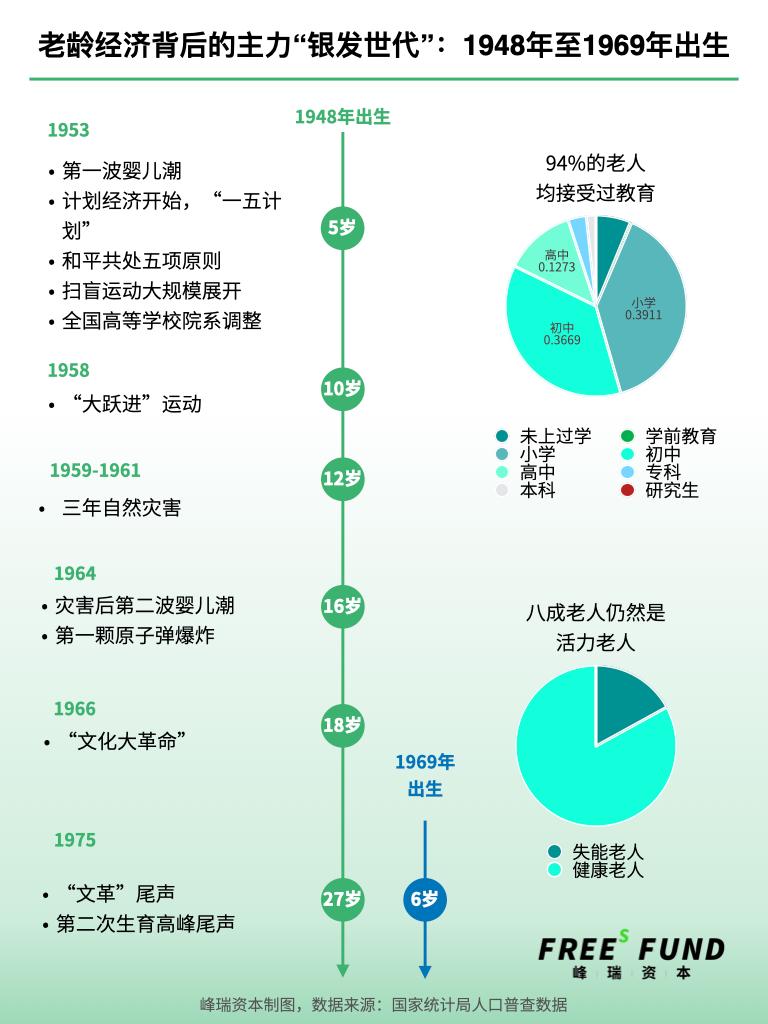 如果把个人和国家大事这两个维度放在一起比对,我们就发现,中国目前的银发世代主力是1948到1969年出生的人。这一代人基本上是在中国第一波和第二波婴儿潮下出生,经历过经济的匮乏,经历过三年自然灾害,也经受过精神文化上的冲击。但这一代人也是见证新中国成立以来诸多荣耀的一代。他们见证过第一个五年计划的成功实施,在扫盲运动下进入学校学习知识,见证过第一颗原子弹的爆炸,在新中国的科技突破中看到一个大国的澎湃叙事,他们也见证过和平共处五项原则指导下的新中国外交,看到新中国初始的崭新国际面貌……因此,这一世代人,他们虽在物质匮乏环境下成长起来,但在精神上却也是非常坚韧、非常荣耀的一代。银发世代,在我们的定义下也就是1948到1969年出生的人,根据国家统计局发布的数据,这一世代出生总人口约为4.5亿,目前还有约3.3亿人口,占人口总数的23.4%。这些人年龄在54- 75岁,绝大多数在69岁以下,女性比男性占比略高。在学历分布上,我们可以看到扫盲运动效果显著,94%以上的老人都接受过基础教育,甚至有5%的老人拥有高等学历。在健康状况上,八成以上的老人都还是尚未失能的较健康老人。
