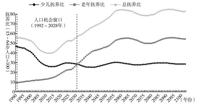 我们还可以用另外一个视角来看人口的结构变化。人口学中有一个维度叫做社会总抚养比,社会总抚养比=( 0-14岁人口数+65岁以上人口数)/ 15-64岁劳动年龄人口数。社会总抚养比如果低于50,意味着相对于被扶养人口,劳动人口更多,整个社会年龄结构相对年轻、健康。人口机会窗口期,也就是看社会总抚养比低于50的时期。