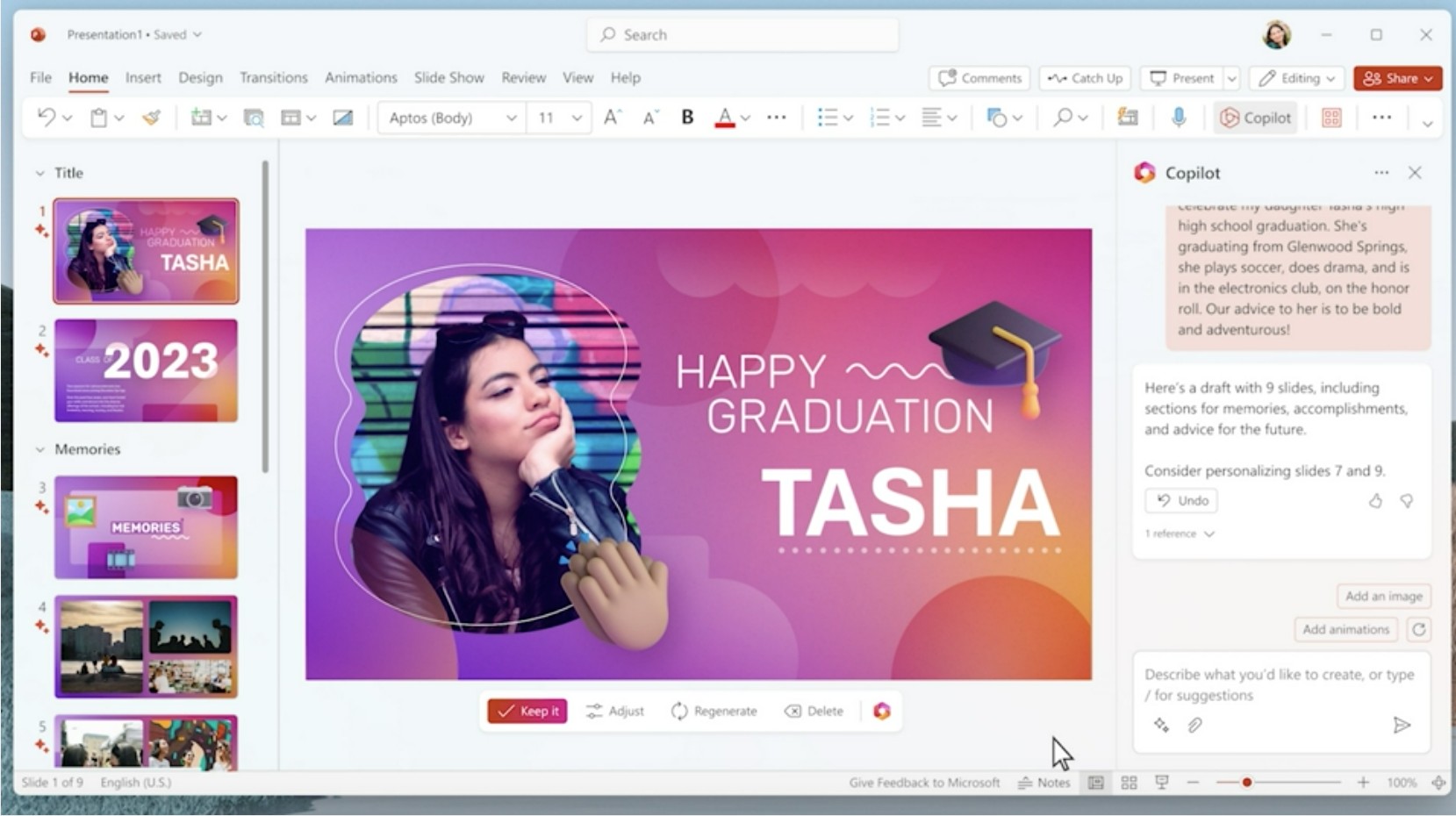 - PPT:在Copilot中输入场合、风格等指示,Copilot可直接生成PPT,若想更换图片,只需要提出对图片的要求,Copilot会自动从用户的网盘(OneDrive)中选取符合要求的图片进行替换。