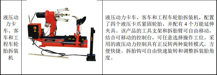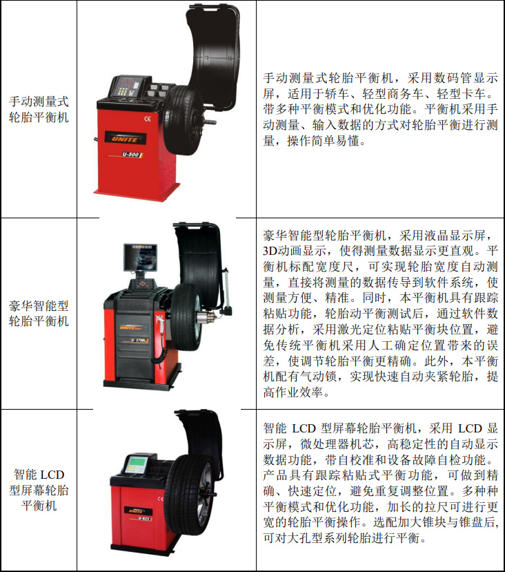公司主要产品包括拆胎机、平衡机、举升机以及稀油加注设备及控制系统、气动抽接油机、变速箱油更换机、电动制动液更换机、高纯度氮气机、冷媒回收加注机等汽车养护设备。
