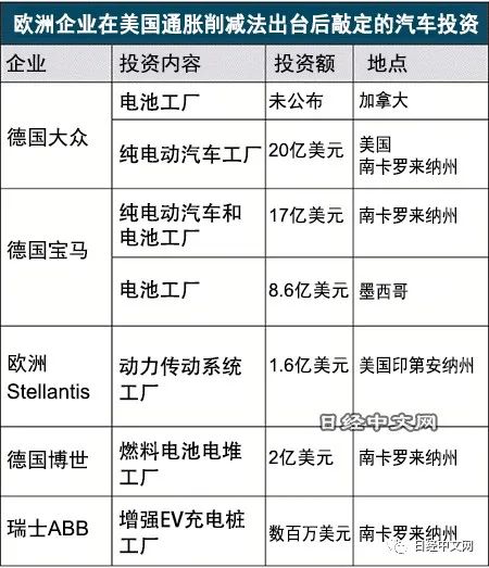 不仅是大众,多家欧洲企业在2022年8月的通胀削减法通过以后,均转向了投资美国。尤其显著的是纯电动汽车相关投资。宝马将在美国南卡罗莱纳州投资10亿美元,设置纯电动汽车的生产设备,投资7亿美元建设车载电池工厂。该公司还将在墨西哥新建电池工厂。