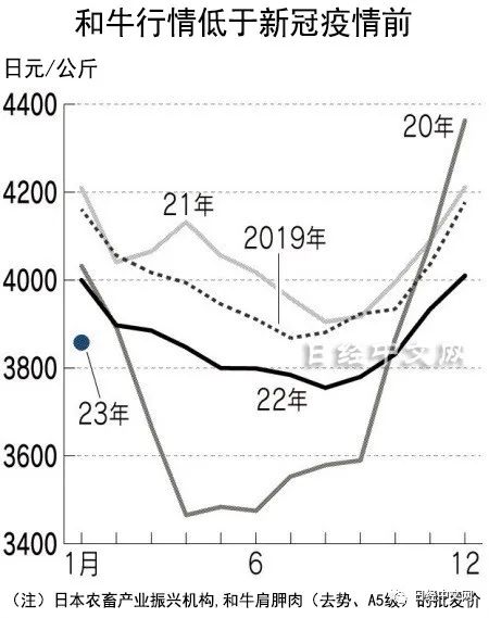 疲软的行情始于2022年。在疫情爆发的2020年,由于餐饮低迷等影响,和牛价格下跌。自2020年底至2021年,餐饮和零售市场的混乱逐步缓解,行情开始复苏。但到2022年,尽管迎来出行限制放宽这一东风,和牛行情反而再次陷入低迷,各月徘徊在低于2021年的水平。进入2023年后仍看不到反转上升的迹象。