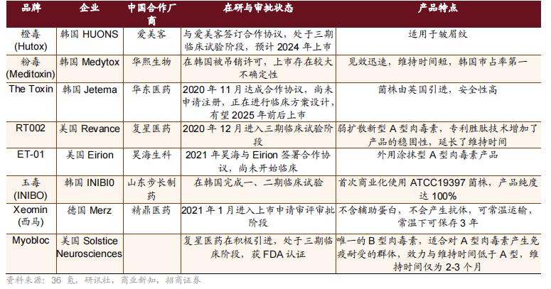 此外,产品研发上,爱美客目前主要专注于肉毒素相关产品的扩充。肉毒素作为一种较为新型除皱瘦脸产品,市场空间较大,因此也成为了大量企业积极布局的下一代产品。根据各家披露的进度来看,大量的产品将在2024-2025年左右上市,难免会造成市场拥挤,加大竞争进而对企业的盈利造成影响。