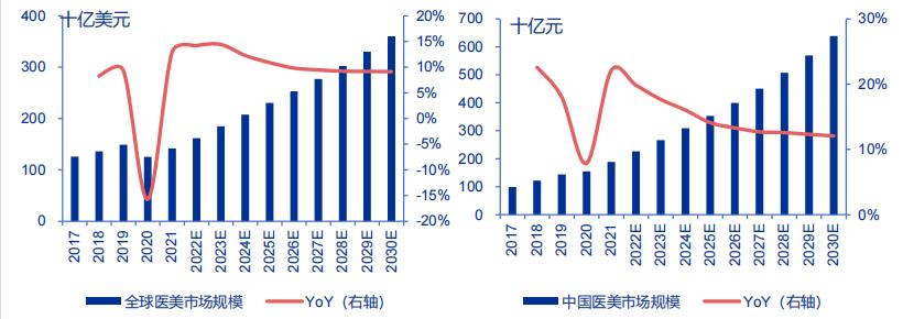 相较于国外发展较为完善的医美市场,国内医美市场正处于爬坡期。Frost&Sullivan统计,全球医美市场已经达到了1500亿美元左右(约合人民币10000亿元元左右),而增长率也在逐年放缓,未来年复合增速会稳定在10%甚至更低的水平。