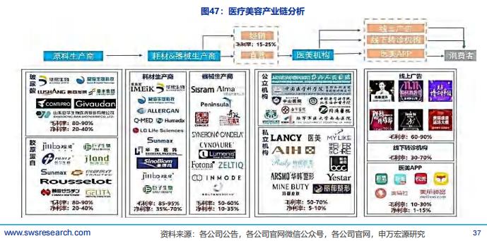 “天时”——爱美客把握住了医美赛道最佳的进场时机。医美产业按照产业链来划分可以分为上游原材料制造商、中游医美器械、耗材生产商和下游的医美机构。