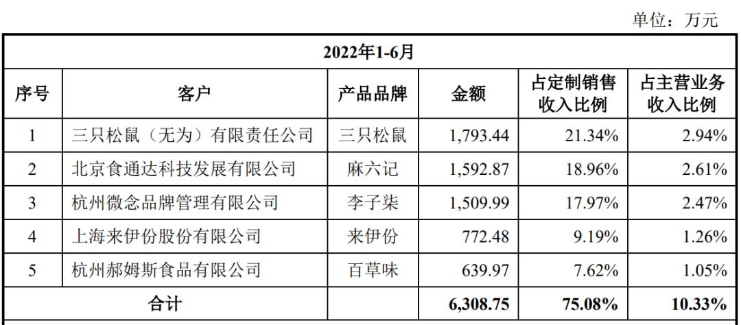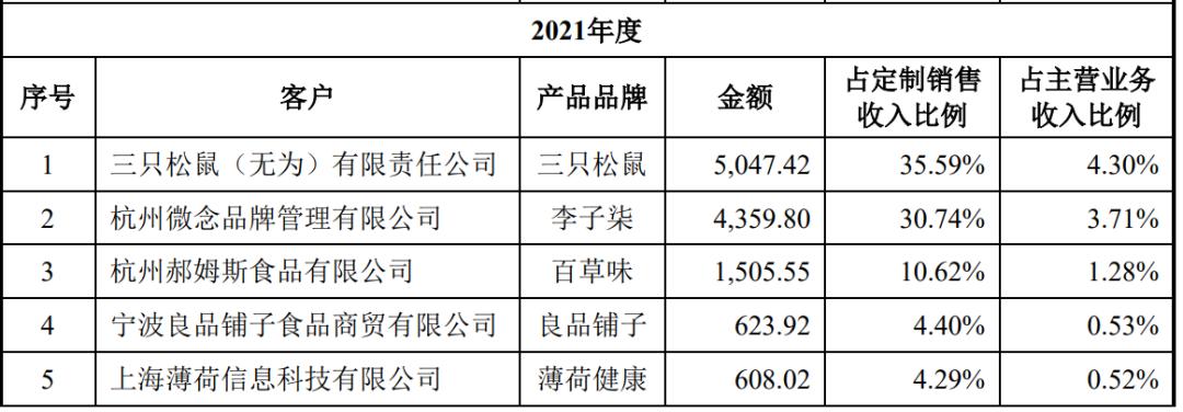 三只松鼠、李子柒、百草味、良品铺子、薄荷健康在2021年度,分别给阿宽食品带来5047.42万元、4359.80万元、1505.55万元、623.92万元、608.02万元的定制销售业务销售额,分别占定制销售收入比例为35.59、30.74%、10.62%、4.40%、4.29%。