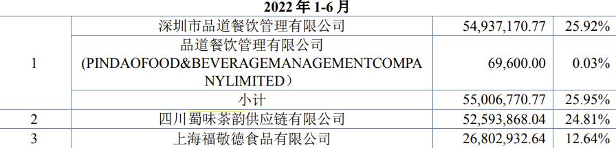 到了2022年上半年,衍变成为奈雪的茶(深圳品道)、茶百道(蜀味茶韵)、一点点(上海福敬德)等新式茶饮占据半壁江山,分别带来营收约5500万元、5259万元、2680万元,占据其总营业收入比例的25.92%、24.81%、12.64%,共同为田野股份贡献占据过半的营收支撑,在2022年上半年实现营收2.12亿元。