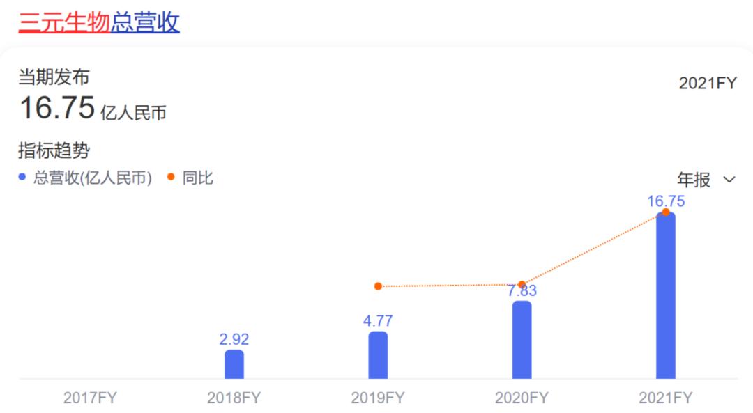 据公开资料分析,元气森林在2018年-2021年期间分别实现营业收入约为2亿元、6.6亿元、27亿元、70亿元,业绩接连翻倍的背后,对应三元生物也获得连年翻倍的业绩增长,在2018年-2021年期间分别实现营业收入2.92亿元、4.77亿元、7.83亿元、16.75亿元,并在2019年时就已经占据了全球33%的赤藓糖醇市场份额。
